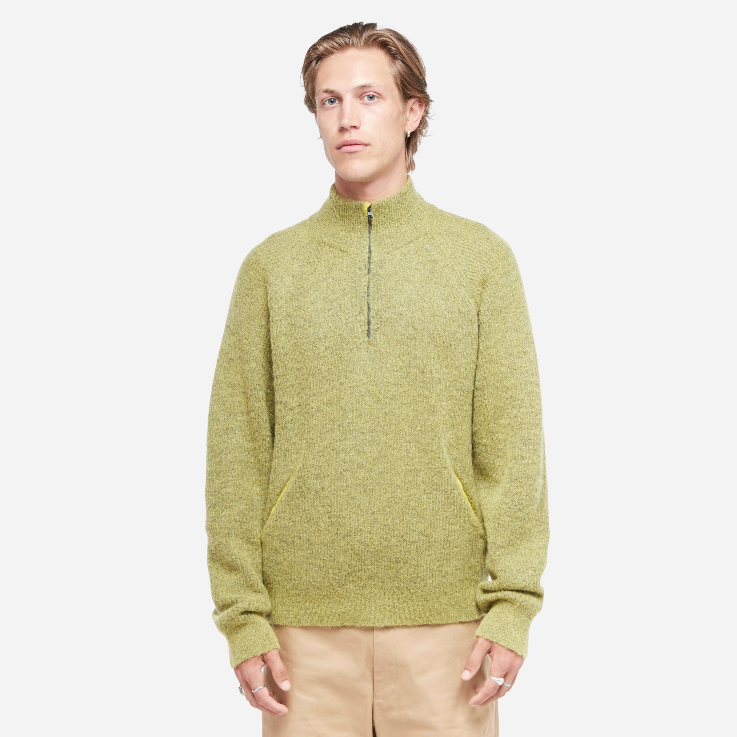 Founded by Wai Tsui in Osia, Hiking Patrol started as a digital space that celebrated outdoor culture and has grown into a lifestyle brand that bridges the gap between outdoor gear and contemporary fashion, with a focus on simplicity, versatility and durability. Yellow – Mohair knit – Half zip – Hand pockets – Model is 6’2.5″ and wears a size medium.
