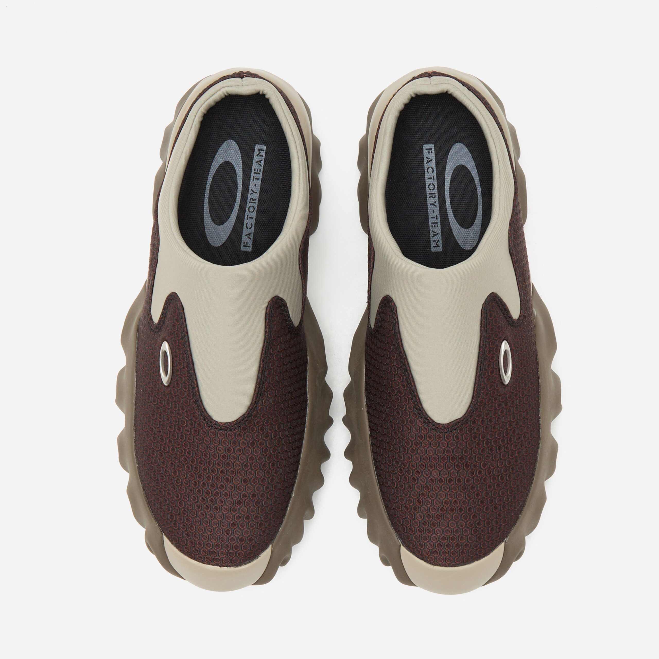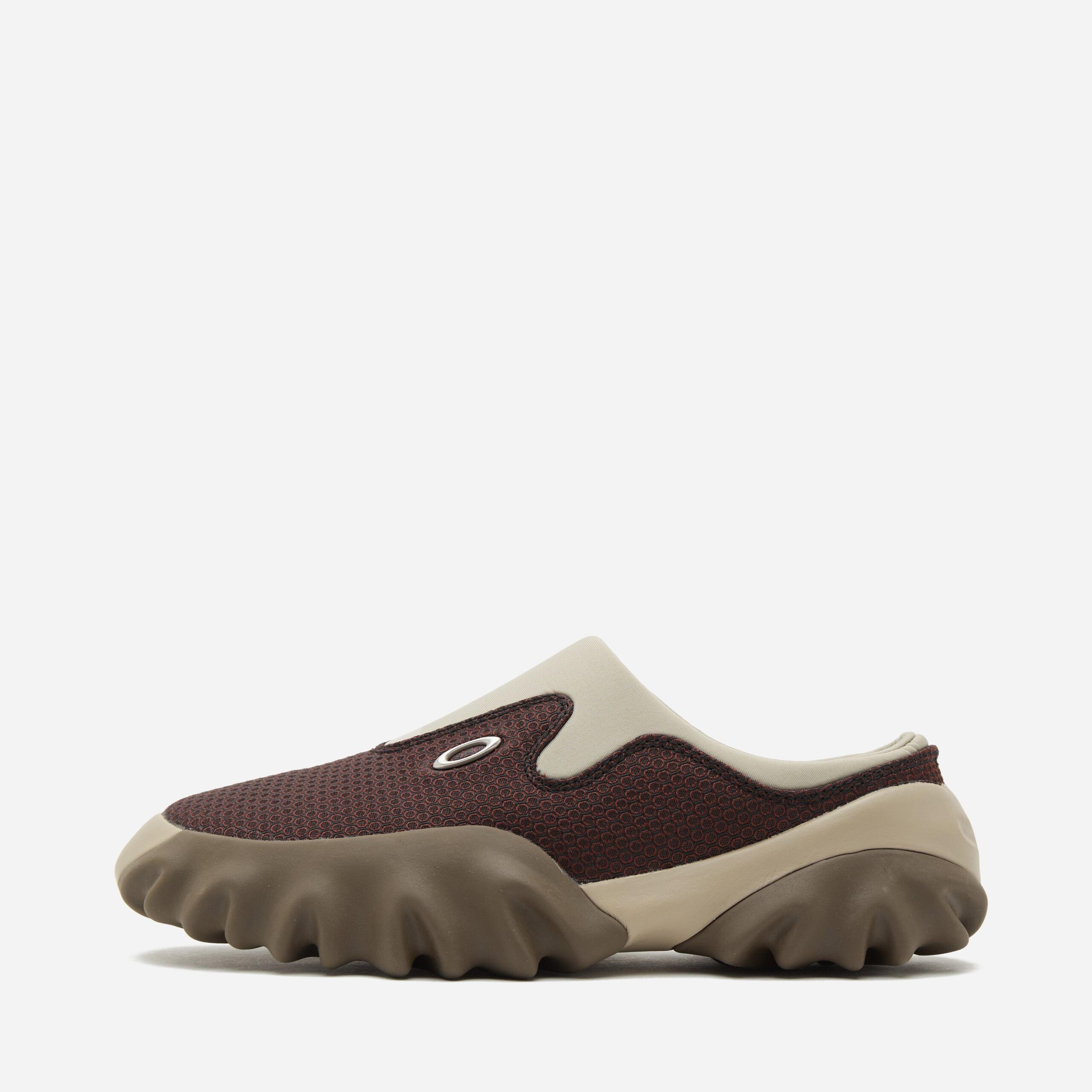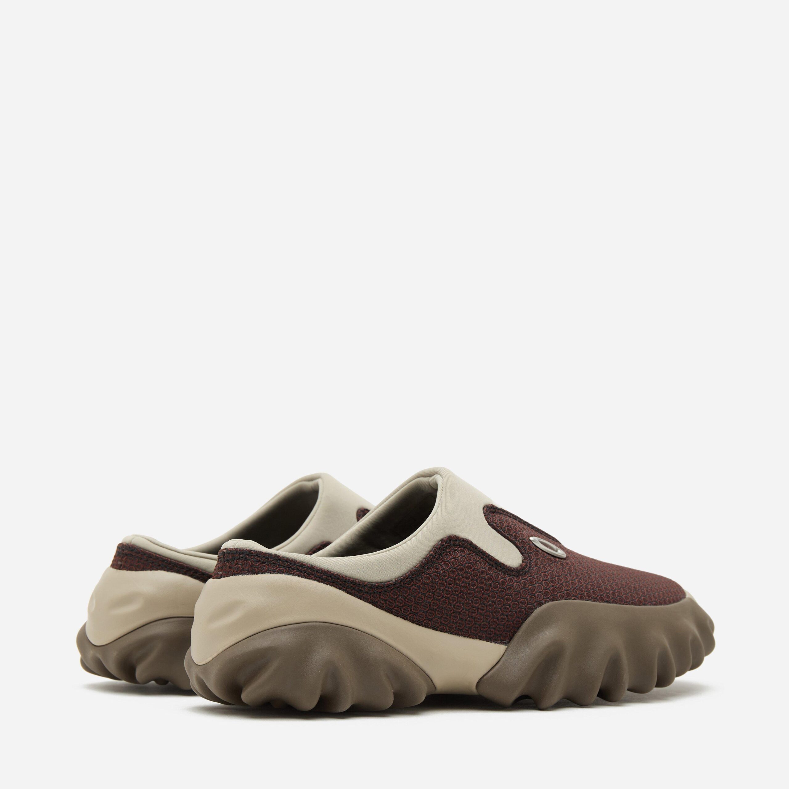 The newly reimagined Oakley Factory Team is conceptualised by experimental collective Brain Dead and powered by Oakley. The Chop Saw is an Oakley design from the ‘2000s, returning in the shape of a mule. The progressive design arrives in a neutral Maroon/Espresso” colourway and is made from a stretchy synthetic upper with a thick rubber outsole. Neoprene helps secure the foot in the laceless mule. Brown – Synthetic upper, rubber outsole – Suede panelling – Neoprene ankle collar – Lycra lining – Regular fit, take your normal size – Style code: BDP23S07003203RD02_