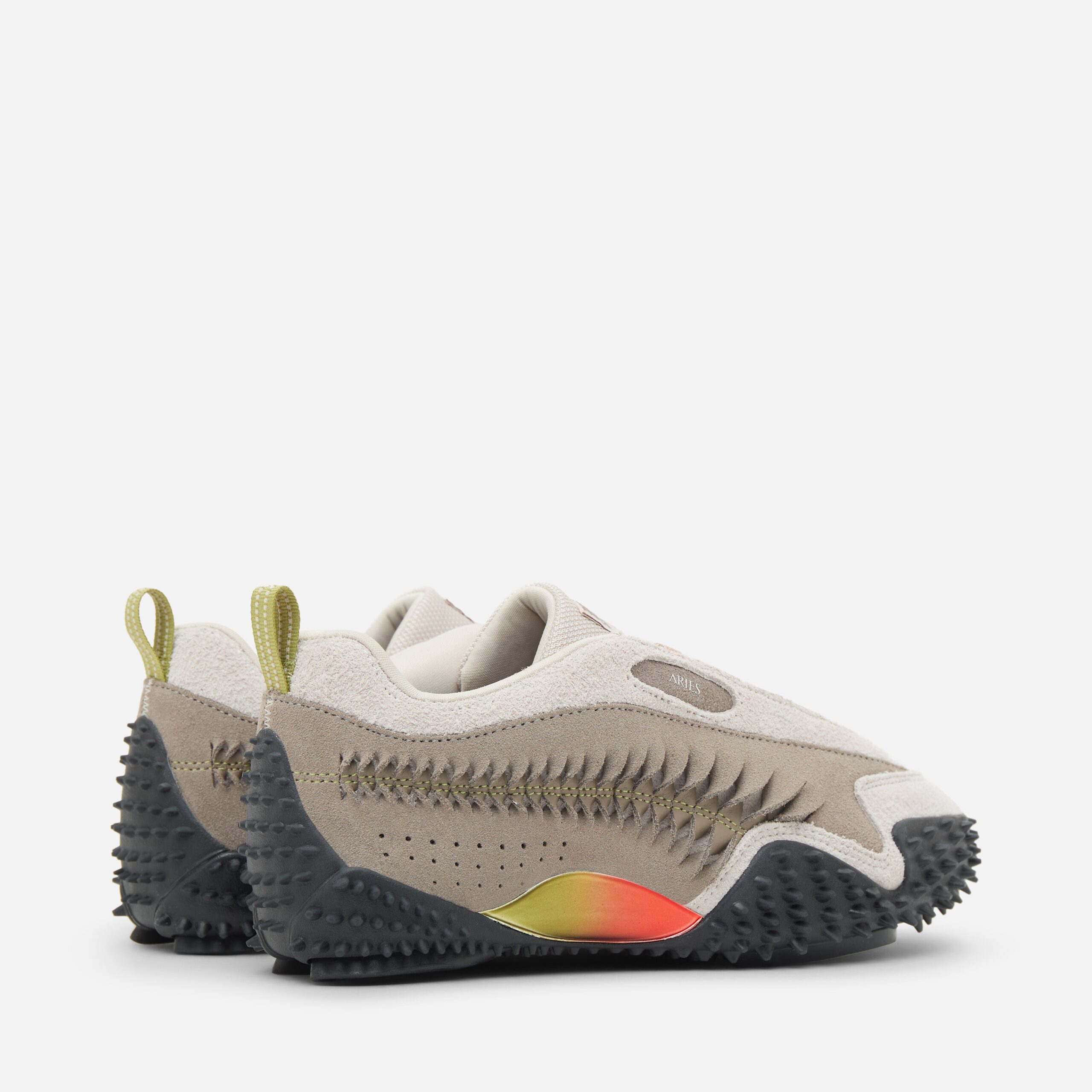 Marking the second instalment in their ongoing partnership and moving away from the usual leather upper, the PUMA Mostro x Aries collaboration in suede exemplifies archival athleticism and avant-garde streetwear, where heritage design meets subversive luxury in every sculpted detail. Grey – Suede upper, rubber spike sole – Craft Formstrip – Metallic midfoot panel – Co-branding – Style code: 401318_01